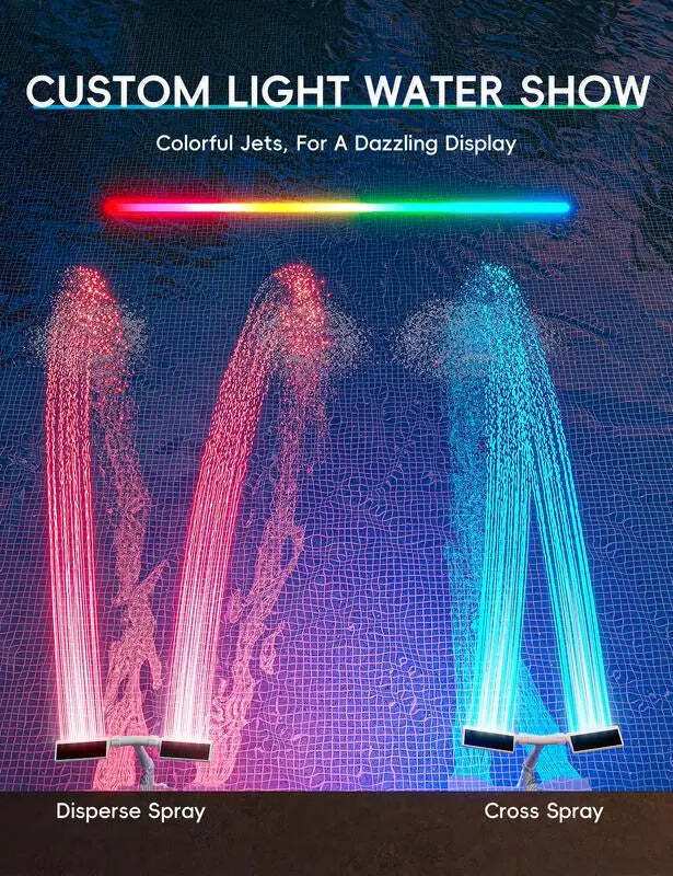 Our solar-powered pool fountain have lights and double spray arches. The fine mist spray cools the air, while the water-operated light show provides relaxing moments day and night. The individually adjustable water height and easy installation make this accessory the perfect addition to any pool.